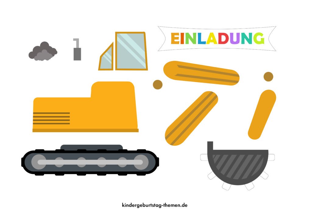 Kostenlose Bagger Einladung Vorlage zum Download: Kreatives Baustellen-Design mit gelbem und schwarzem Cartoon-Bagger, perfekt für Kindergeburtstage und Bau-Themenfeiern. Einfach herunterladen und gestalten.