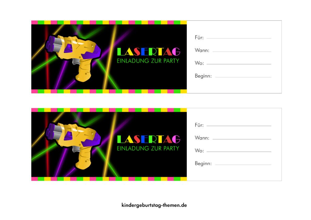 Kostenlose Lasertag Einladungsvorlage in Form einer Space-Pistole zum Ausdrucken für den Kindergeburtstag. Perfekt für spaßige und einzigartige Party-Einladungen zum Lasertag.